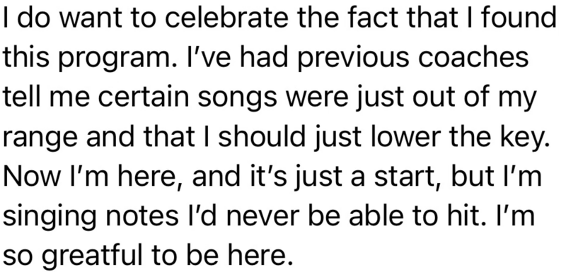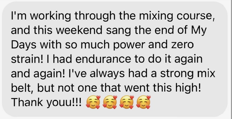 On demand step-by-step trainings on mixing, belting, vocal confidence, performance, recording yourself, and more. You don’t have to wonder what to work on next, it’s all there.